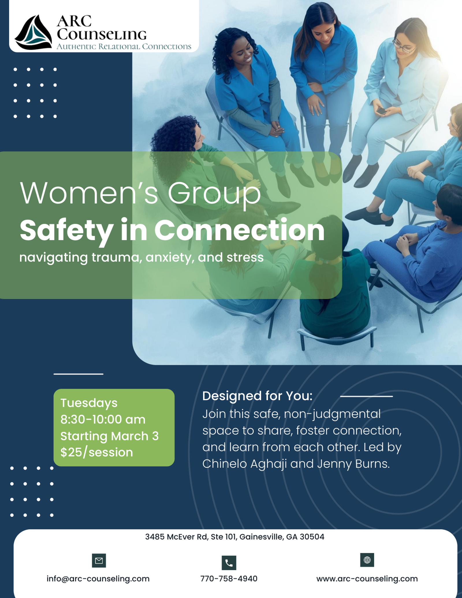 ARC Counseling is excited to offer Safety in Connection, a professionally led weekly women’s group designed for women navigating trauma, anxiety, and chronic stress. This group provides a structured, therapeutic environment that supports emotional regulation, relational insight, and meaningful connection within a clinically grounded setting.